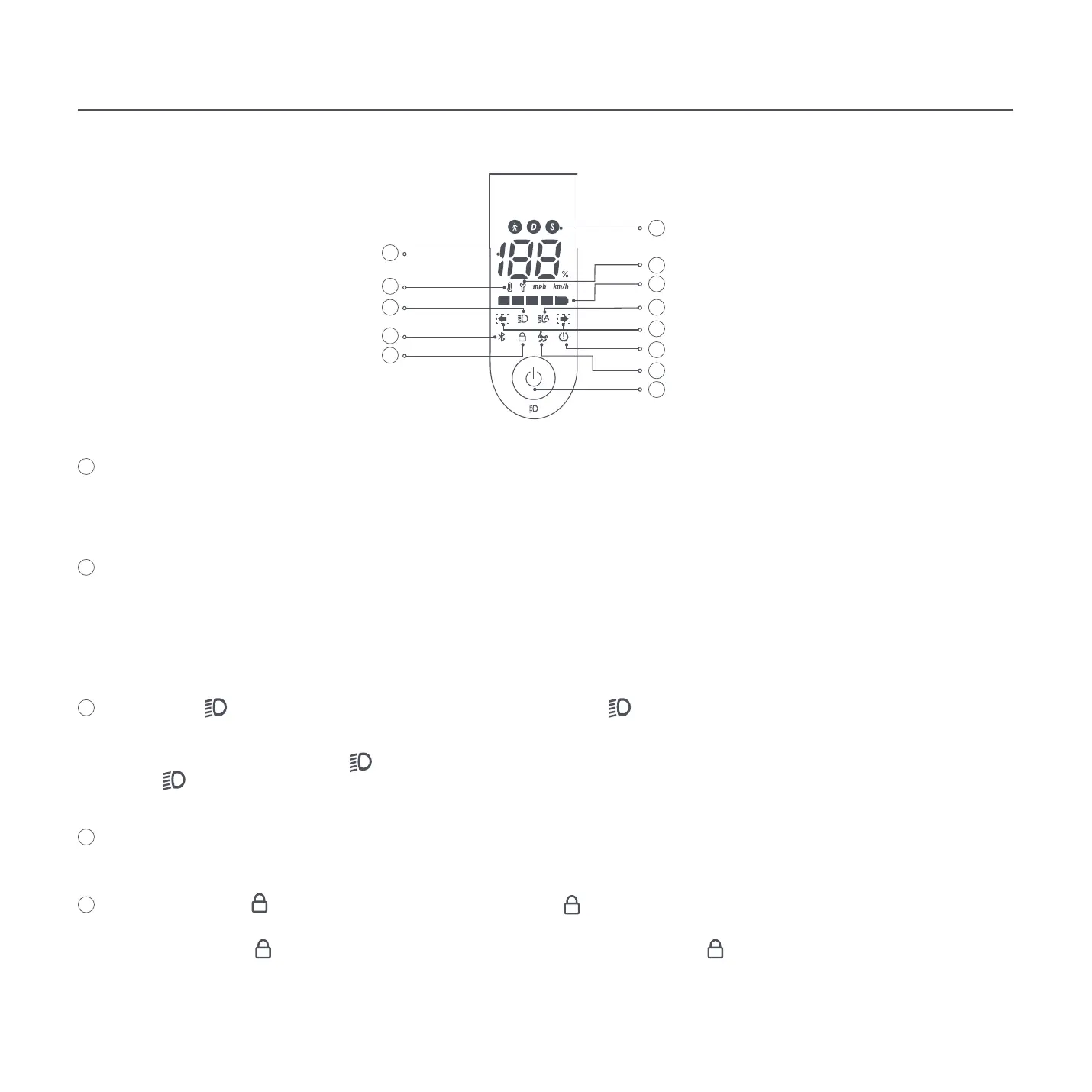 Speedometer: It displays the current speed when the scooter is working. When the scooter has an issue, it displays an error
