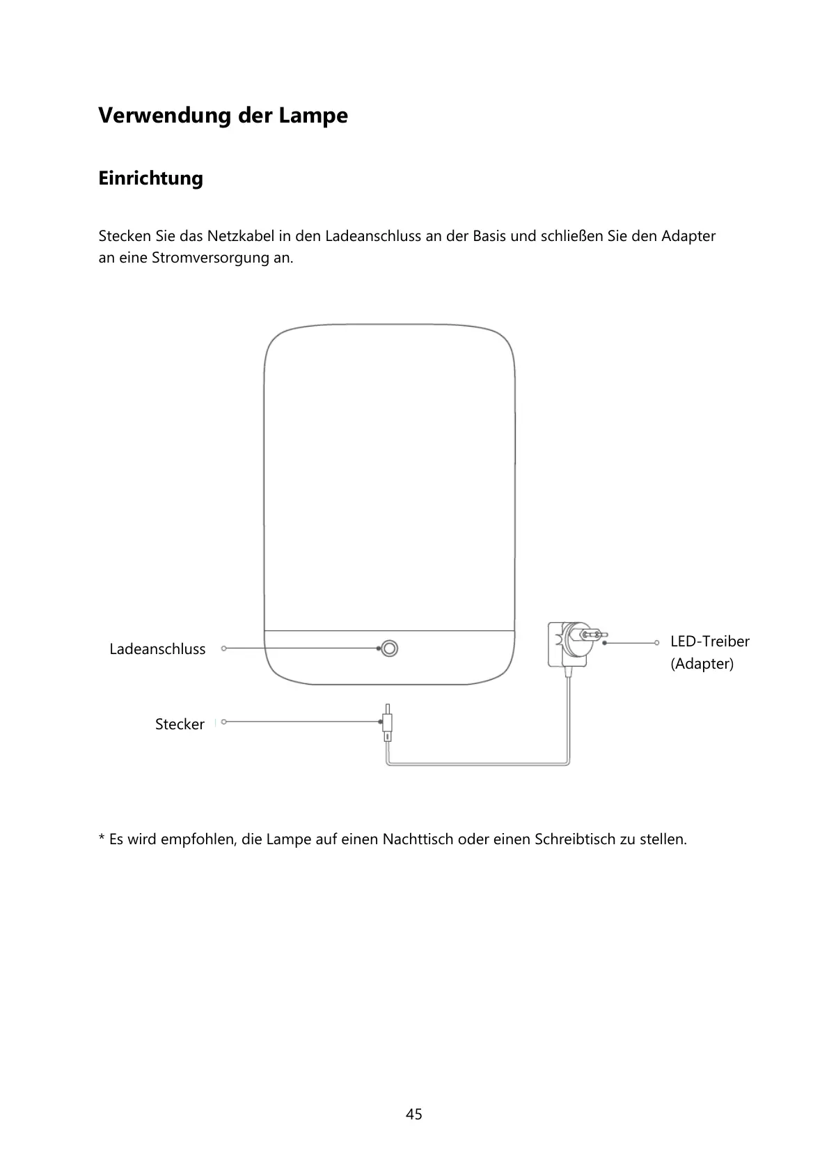 * Es wird empfohlen, die Lampe auf einen Nachttisch oder einen Schreibtisch zu stellen.