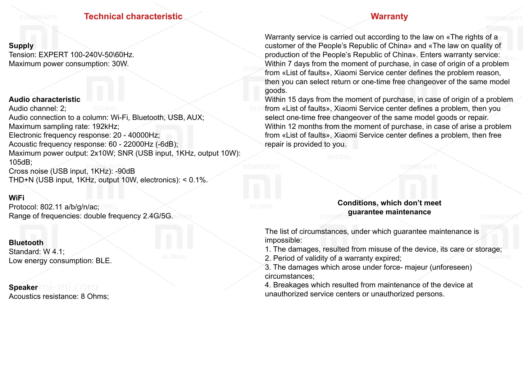 The list of circumstances, under which guarantee maintenance is