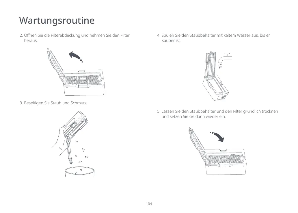 4. Spülen Sie den Staubbehälter mit kaltem Wasser aus, bis er