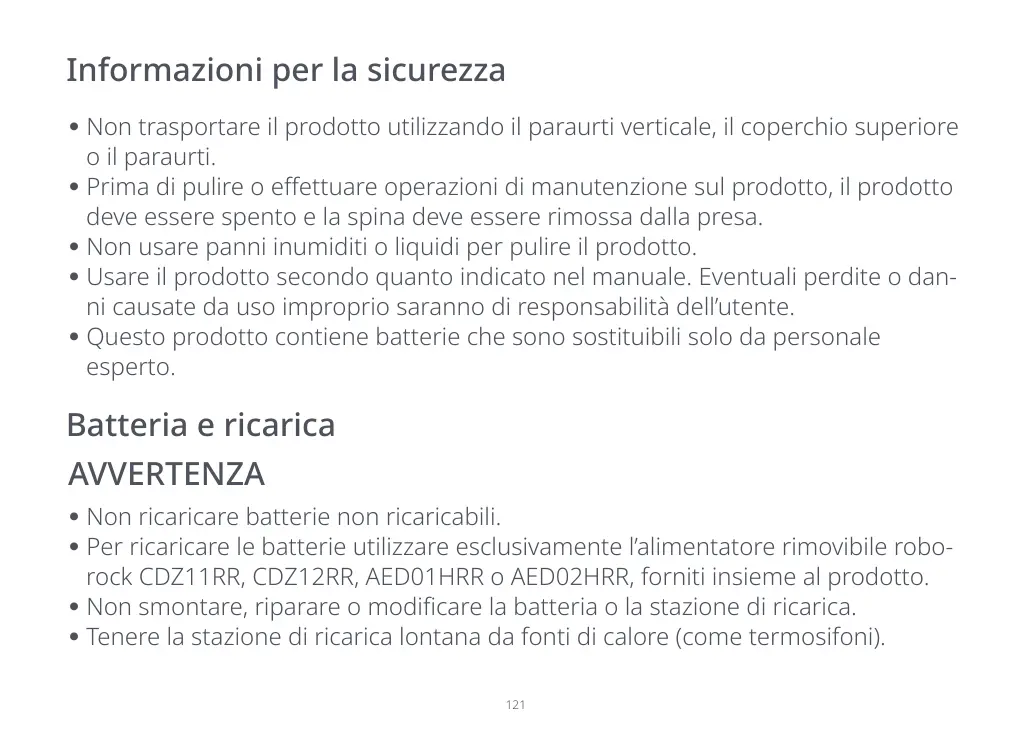 Non smontare, riparare o modicare la batteria o la stazione di ricarica.
