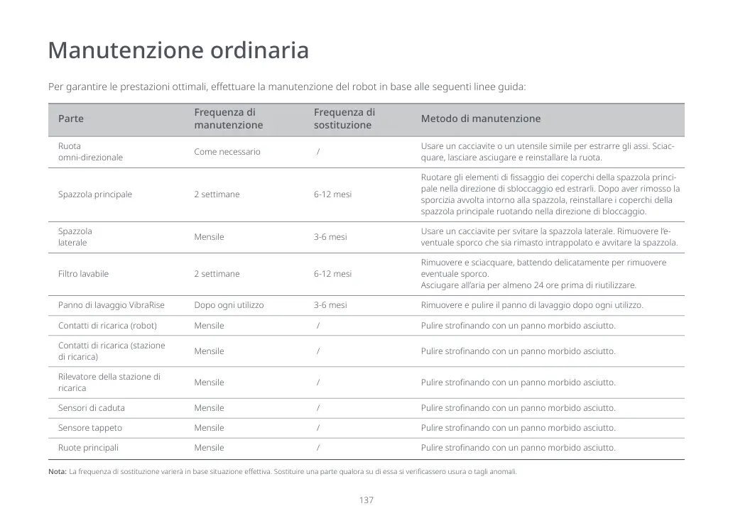 Per garantire le prestazioni ottimali, eettuare la manutenzione del robot in base alle seguenti linee guida:
