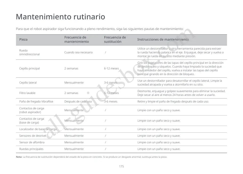 Para que el robot aspirador siga funcionando a pleno rendimiento, siga las siguientes pautas de mantenimiento: