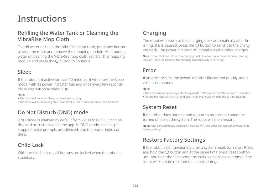 Note: After a system reset, cleaning schedules, WiFi, and other settings will be restored to