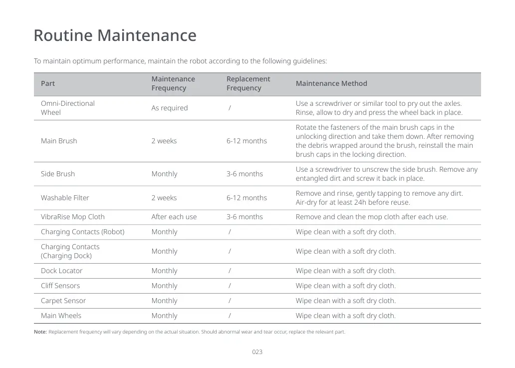 To maintain optimum performance, maintain the robot according to the following guidelines: