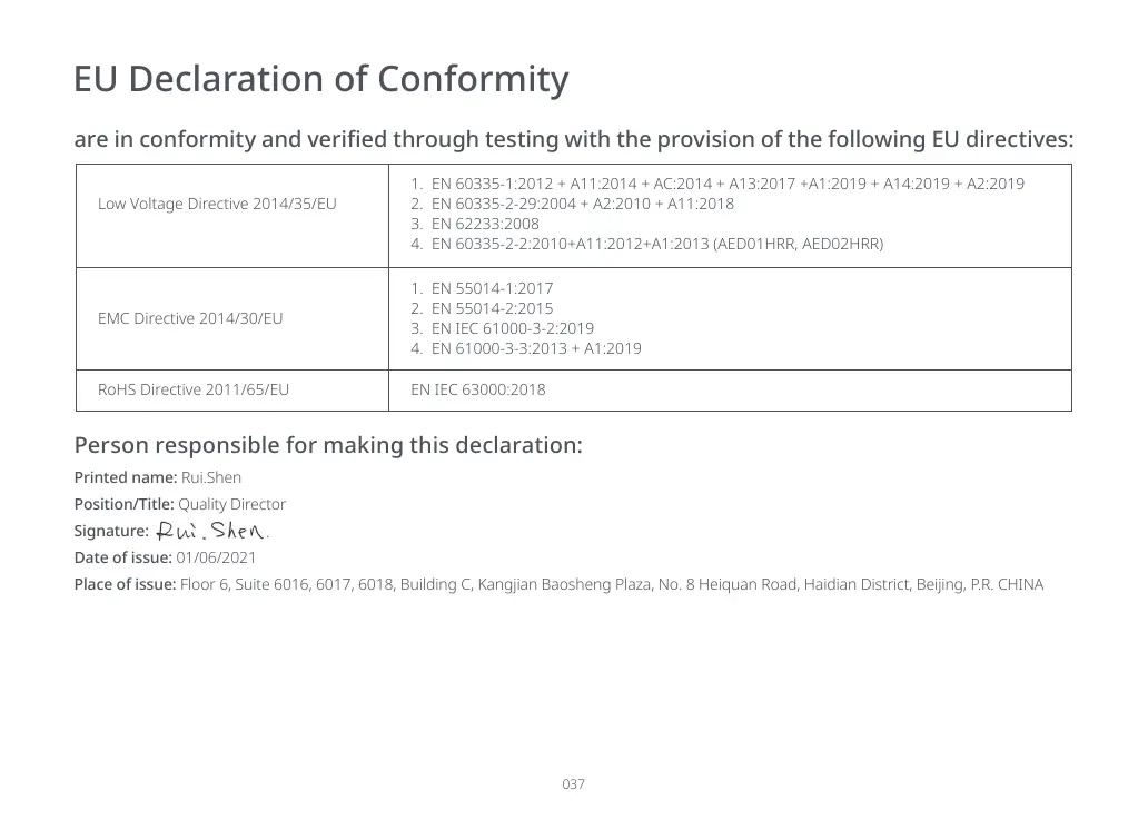 4. EN 60335-2-2:2010+A11:2012+A1:2013 (AED01HRR, AED02HRR)