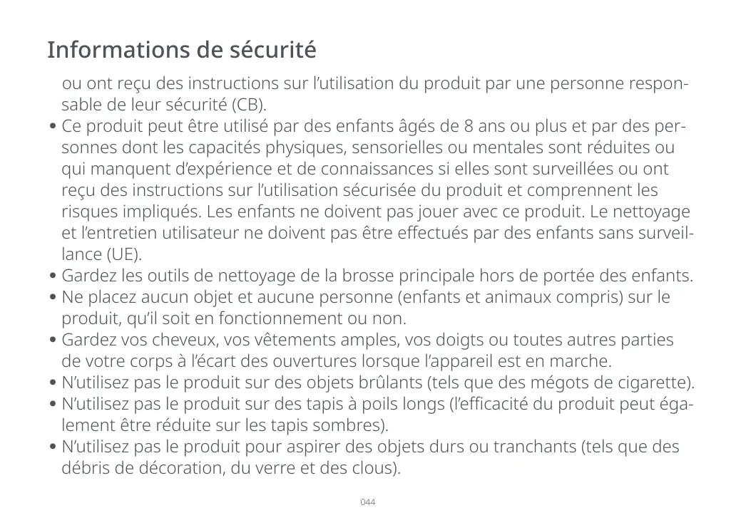 risques impliqués. Les enfants ne doivent pas jouer avec ce produit. Le nettoyage