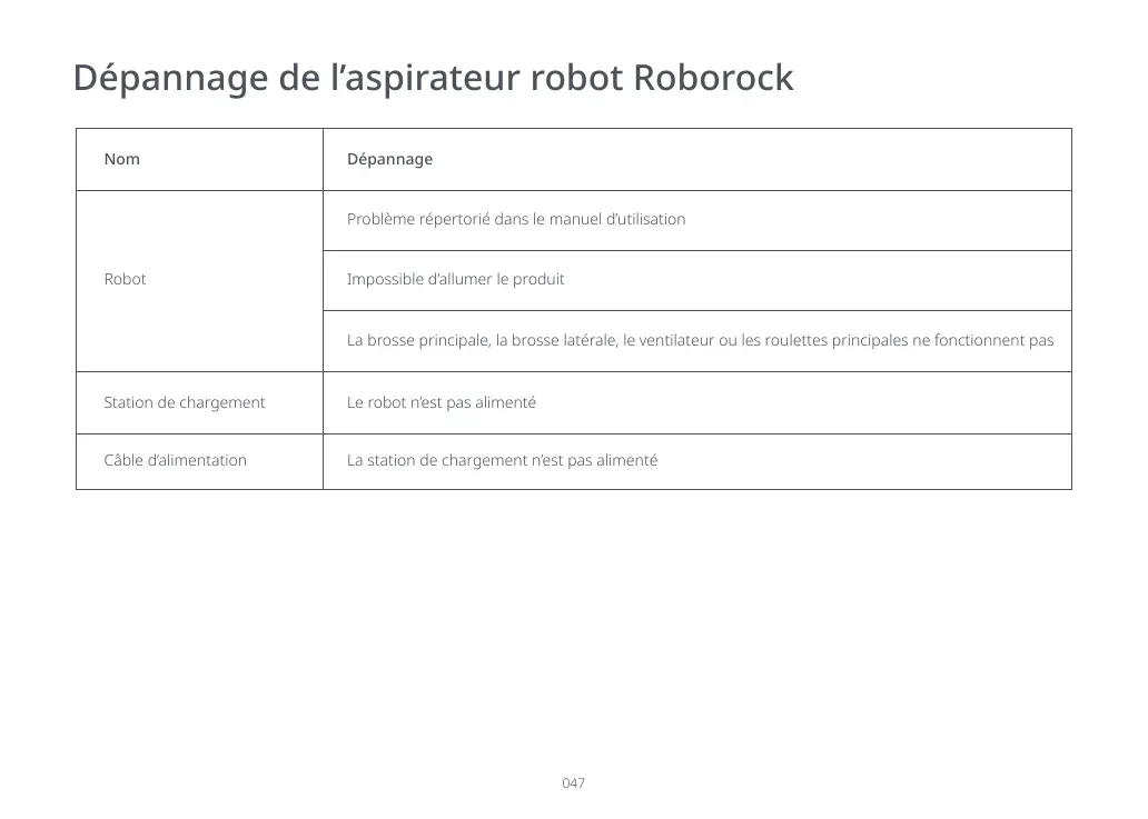 La brosse principale, la brosse latérale, le ventilateur ou les roulettes principales ne fonctionnent pas
