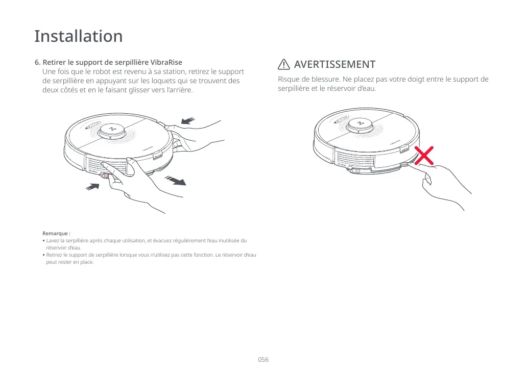 Retirez le support de serpillière lorsque vous n’utilisez pas cette fonction. Le réservoir d’eau