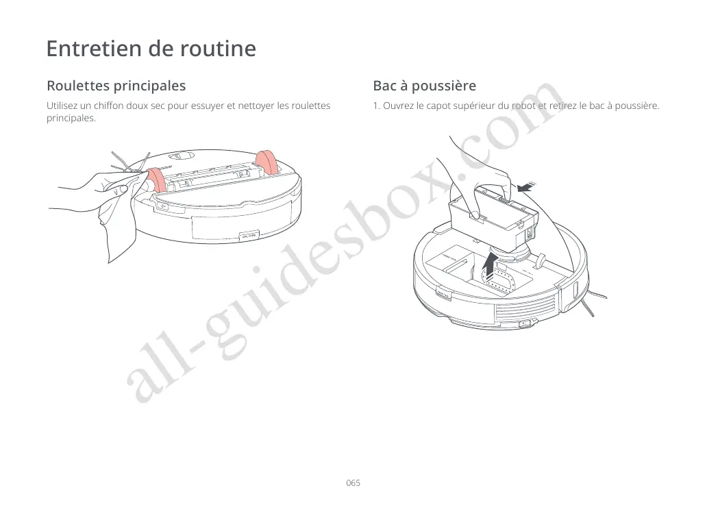 1. Ouvrez le capot supérieur du robot et retirez le bac à poussière.