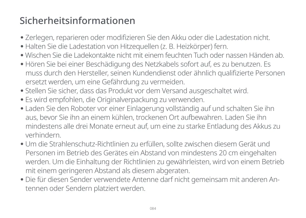 Laden Sie den Roboter vor einer Einlagerung vollständig auf und schalten Sie ihn