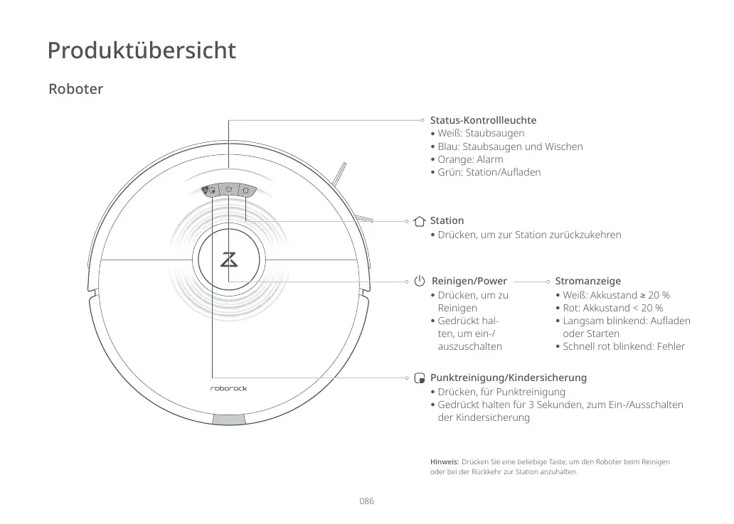 Hinweis: Drücken Sie eine beliebige Taste, um den Roboter beim Reinigen