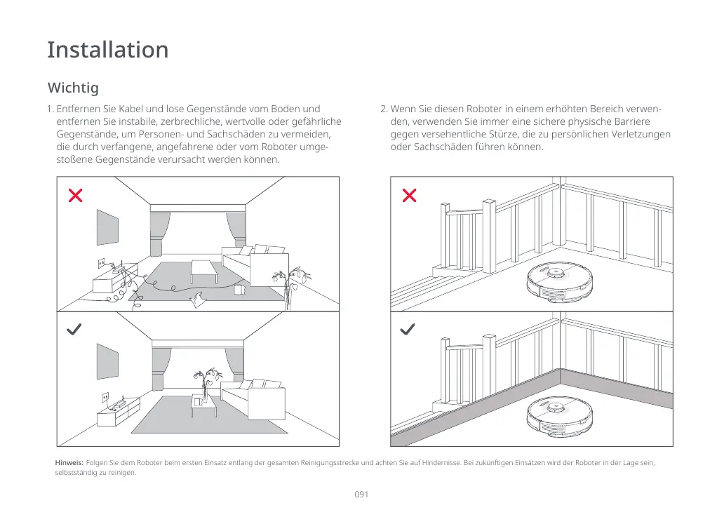 Folgen Sie dem Roboter beim ersten Einsatz entlang der gesamten Reinigungsstrecke und achten Sie auf Hindernisse. Bei zukünftigen Einsätzen wird der Roboter in der Lage sein,