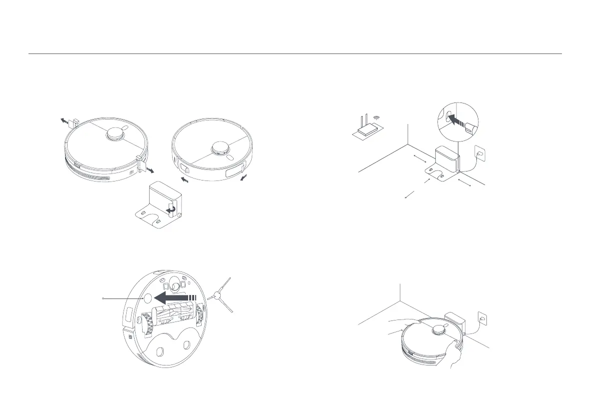 Nainstalujte boční kartáč na svorku na spodní straně robotického vysavače.