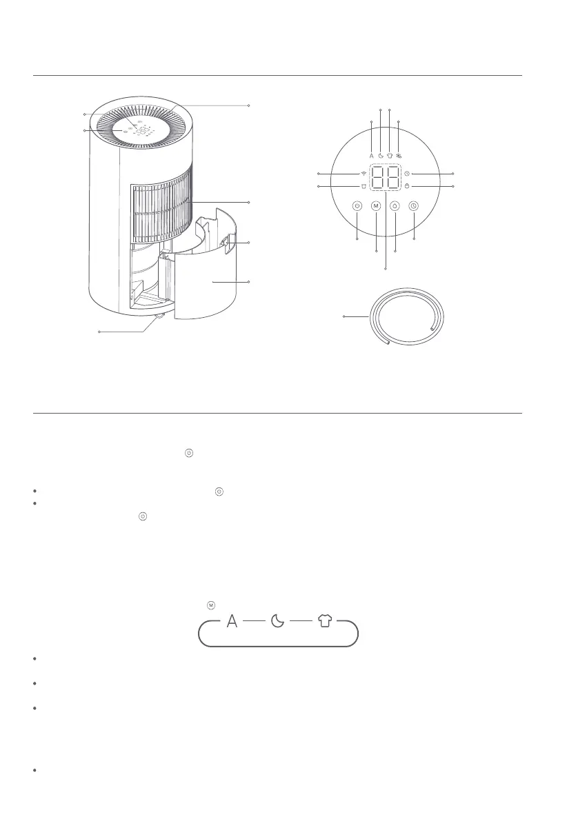 Gdy osuszacz jest włączony, naciśnij przycisk , aby przełączać tryby inteligentny, uśpienia i suszenia ubrań.