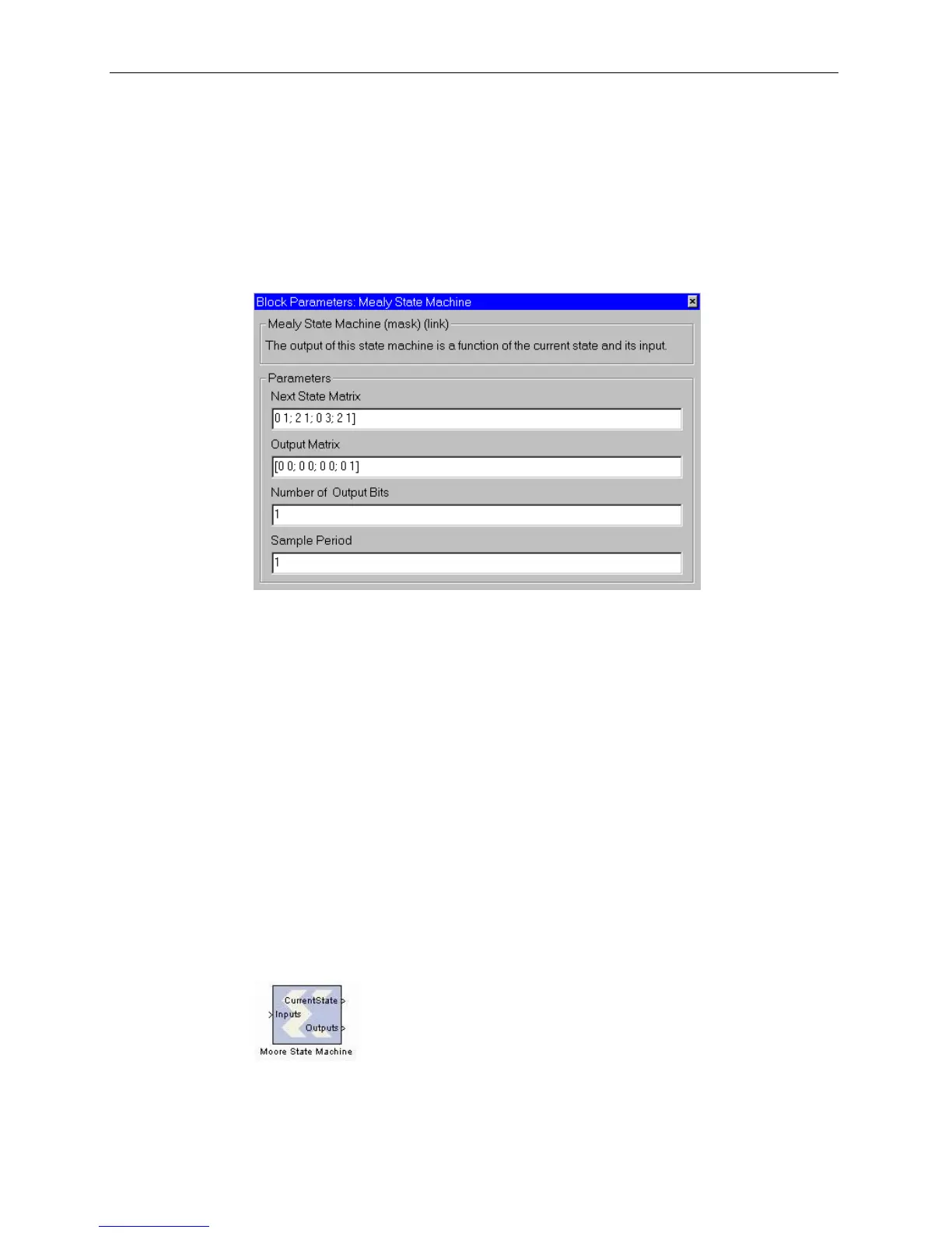The Xilinx Moore State Machine block implements a state machine