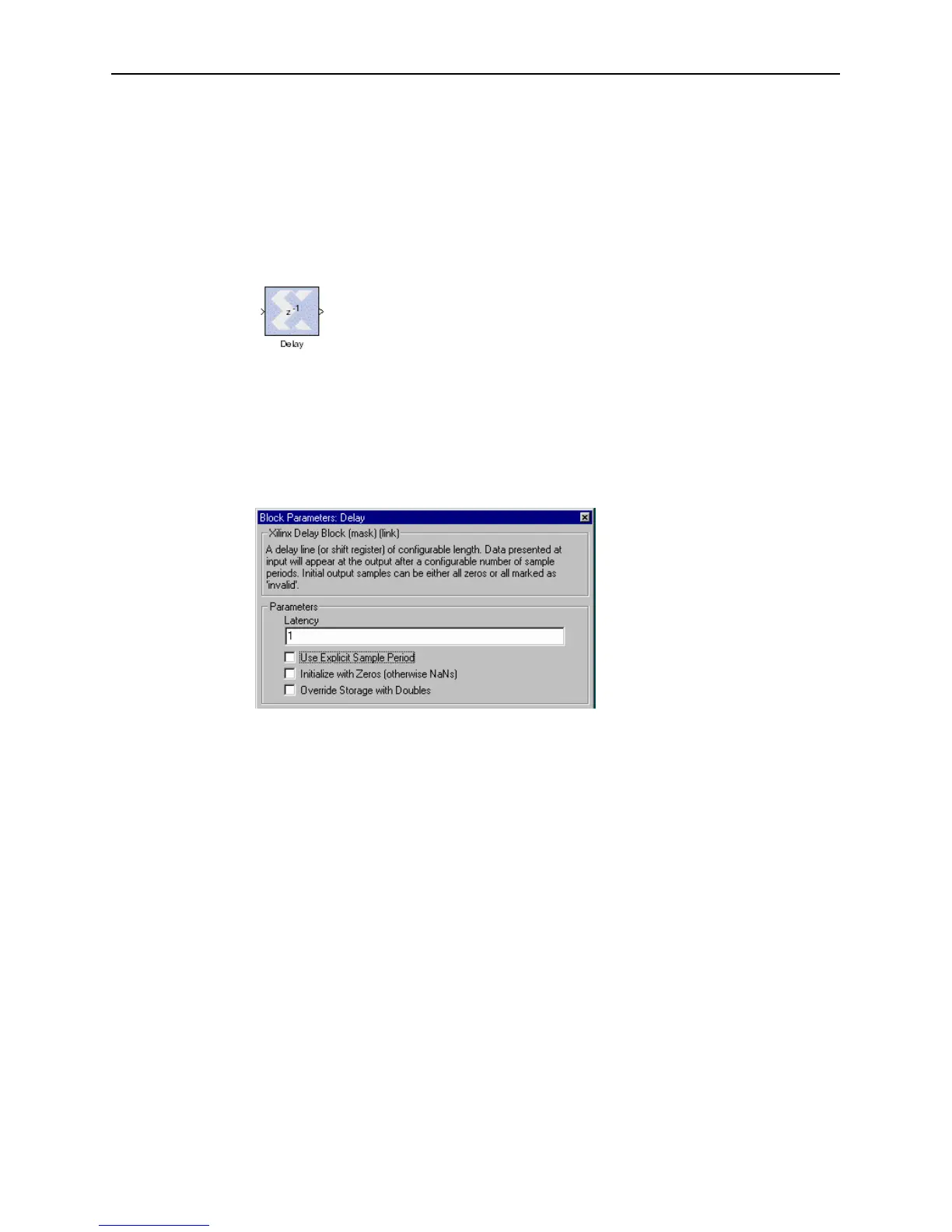 The Xilinx Delay block is a delay line (also called a shift register) of