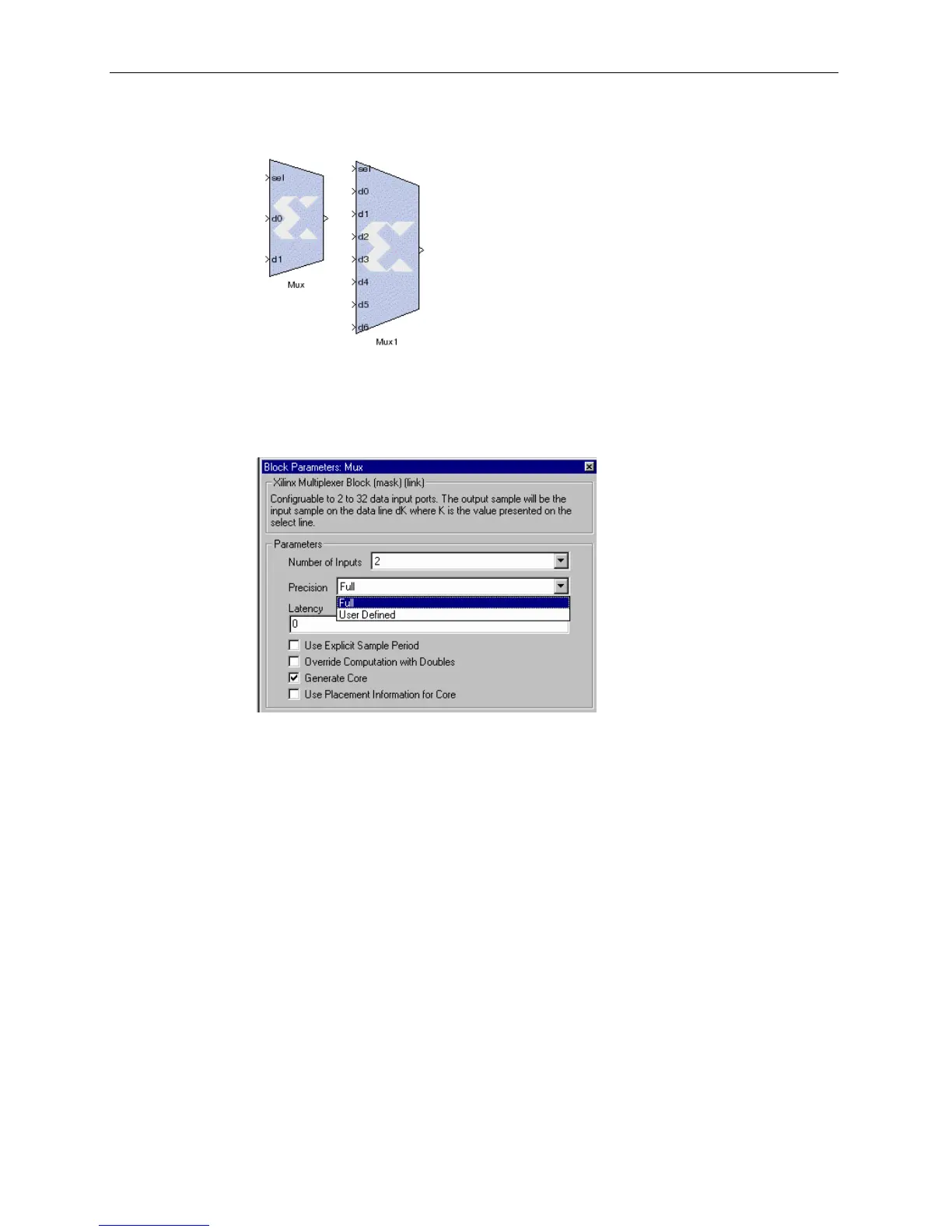 The block uses the Xilinx LogiCORE Bus Multiplexer V5.0. When the Generate Core