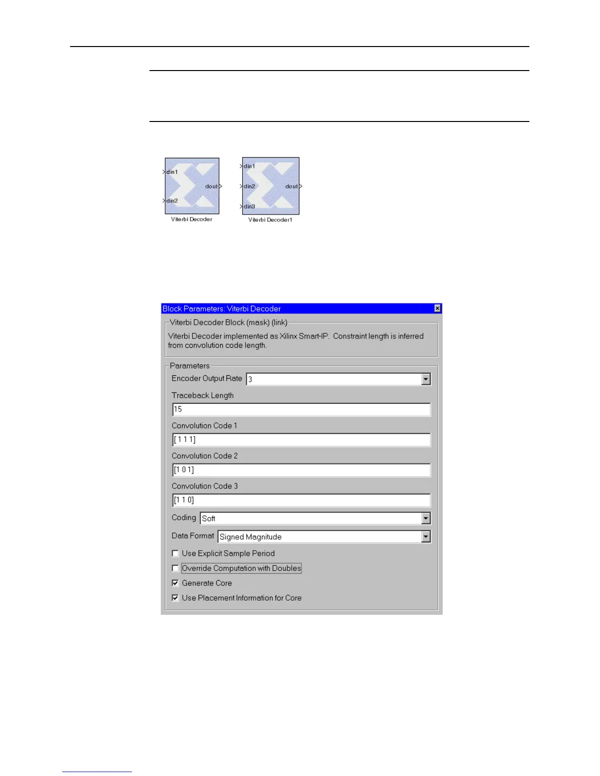 Parameters specific to the Viterbi Decoder block are:
