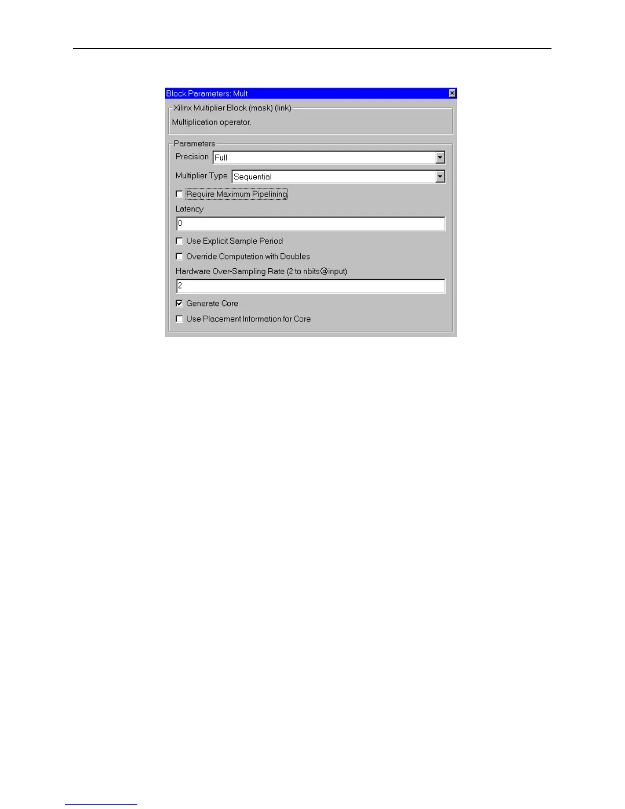 The Mult block always uses Xilinx LogiCORE: Multiply Generator V4.0.