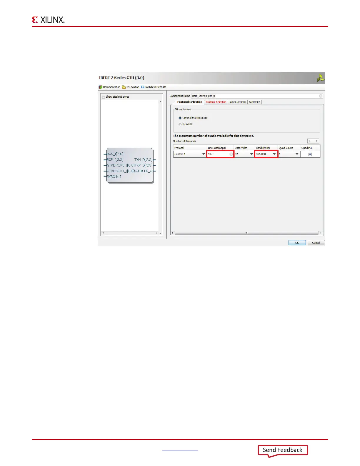 LineRate(Gbps) to 13.0. Use the drop-down menu to change the Refclk(MHz)
