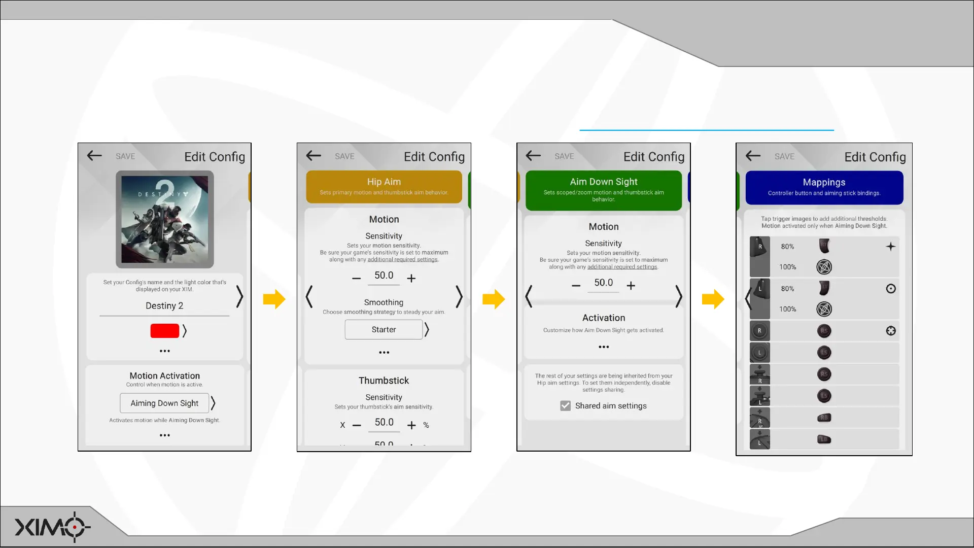 These sections include Hip and Aim Down Sight (ADS) settings and button mappings (bindings).