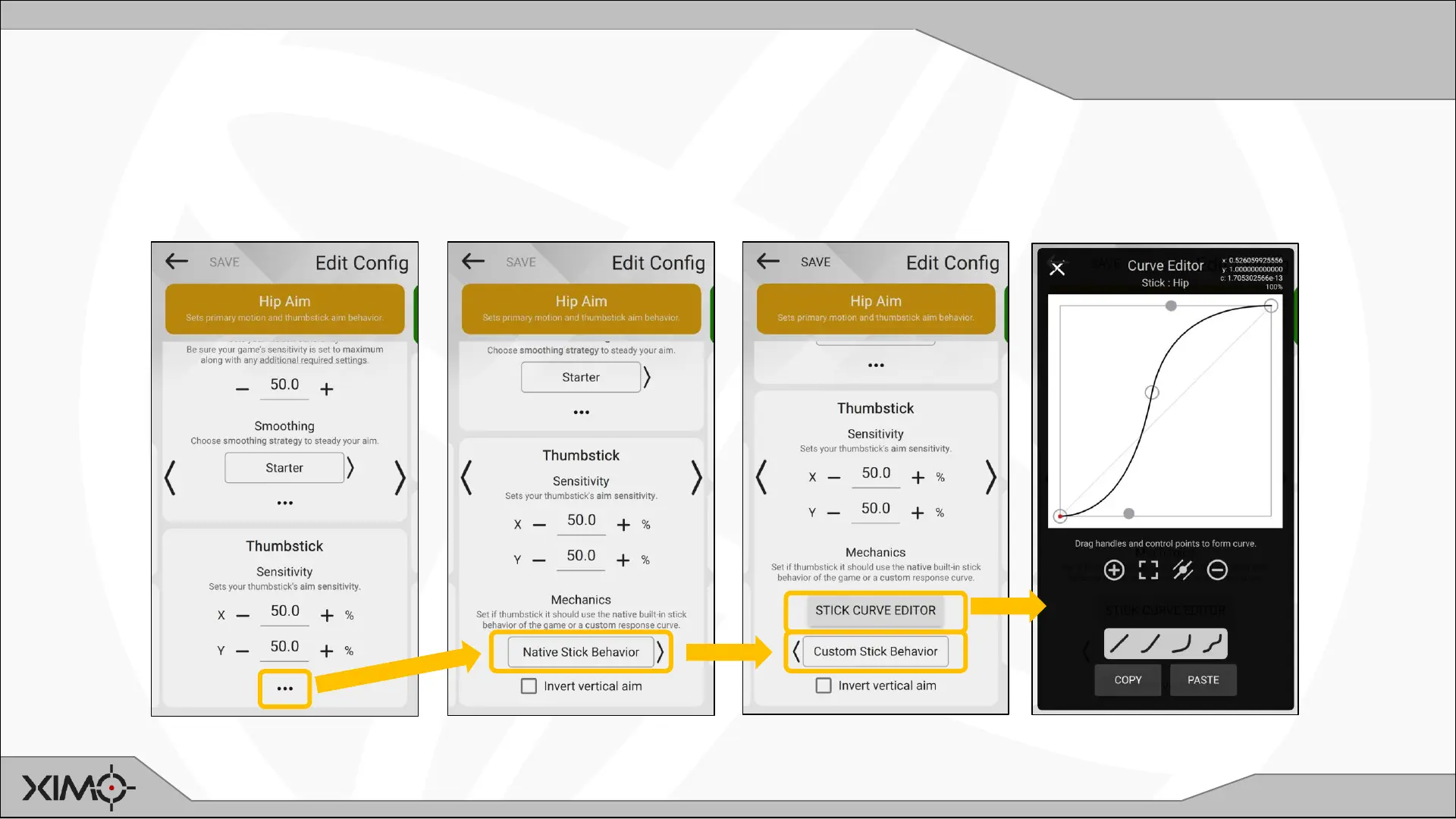 Ximo NEXUS - True Stick Curves; Customizable Stick Aiming Curves; Native vs. Custom Stick Behavior; Stick Curve Editor