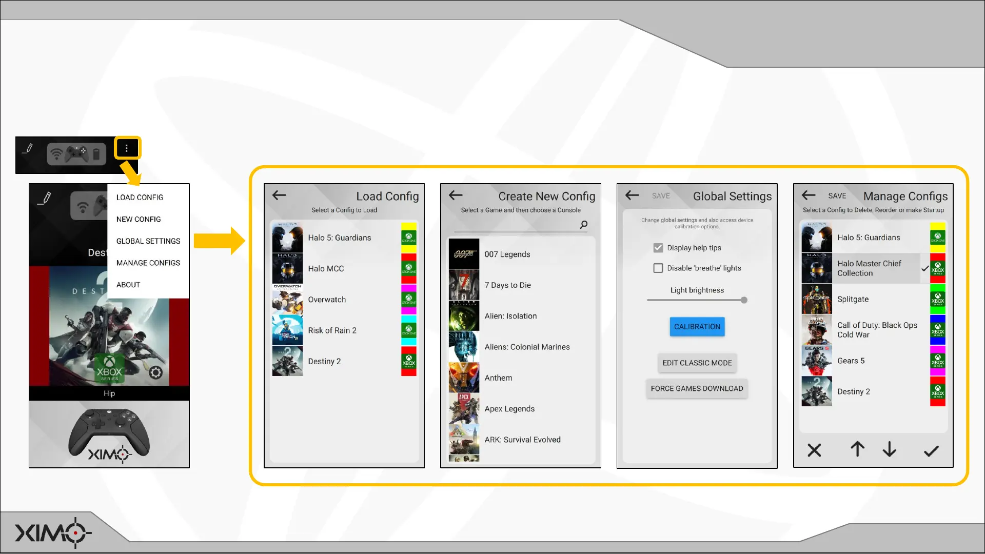 Access the additional options menu for Loading Configs, Deleting Configs and Global Settings (includes Calibration).