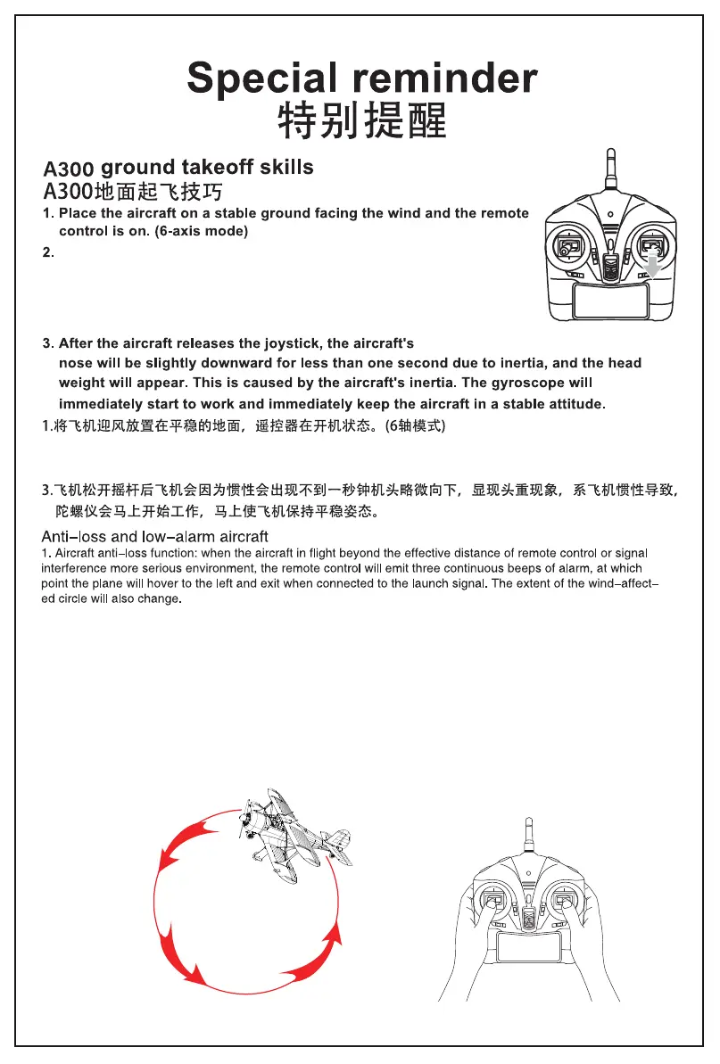 注意事项:在室外飞行尽量不要超出视线范围,避免操作不当飞丢,低电报警时应及时调整飞机姿态提前安全降落。