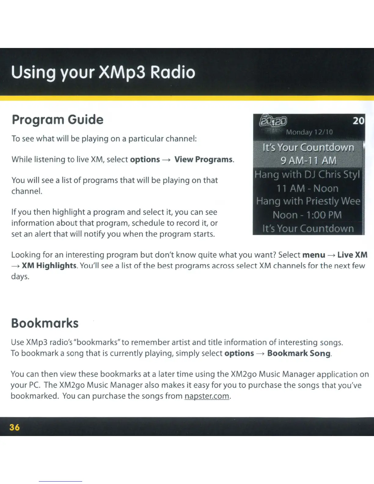 then view these bookmarks at a later time using the XM2go Music Manager application on