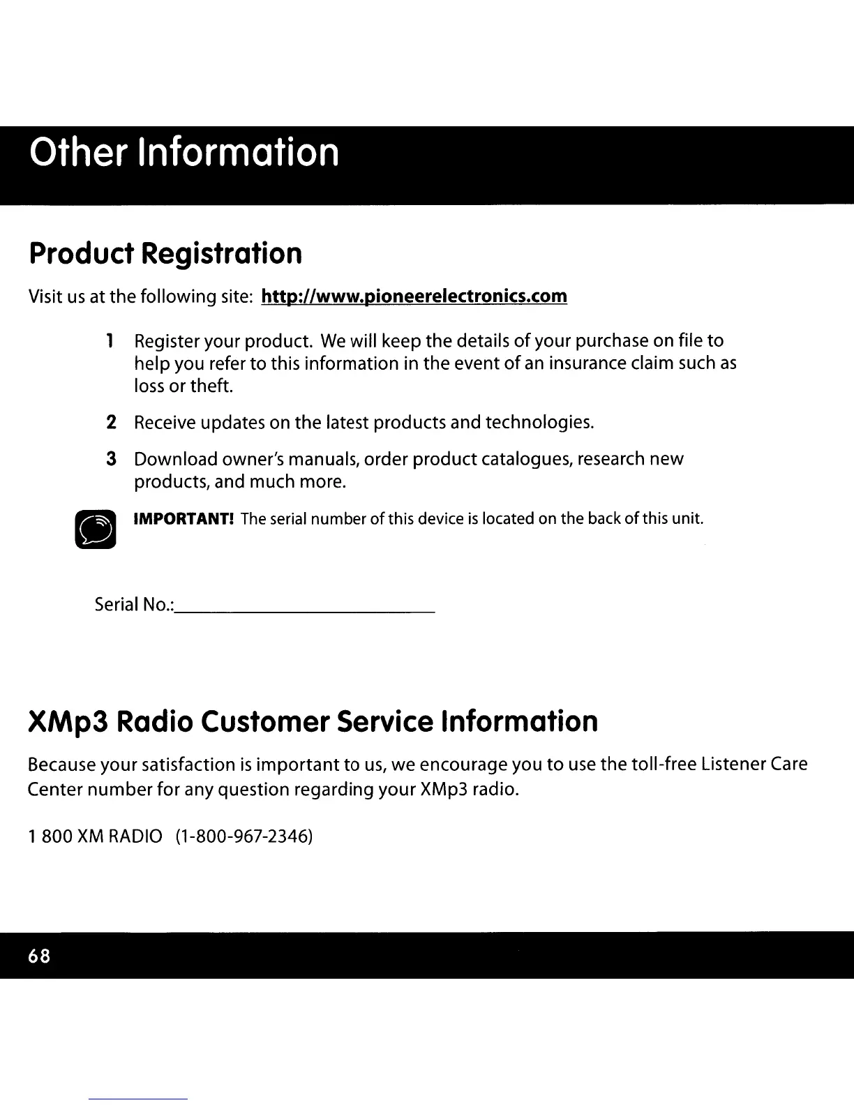 XM XMP3 - Product Registration; XMp3 Radio Customer Service Information