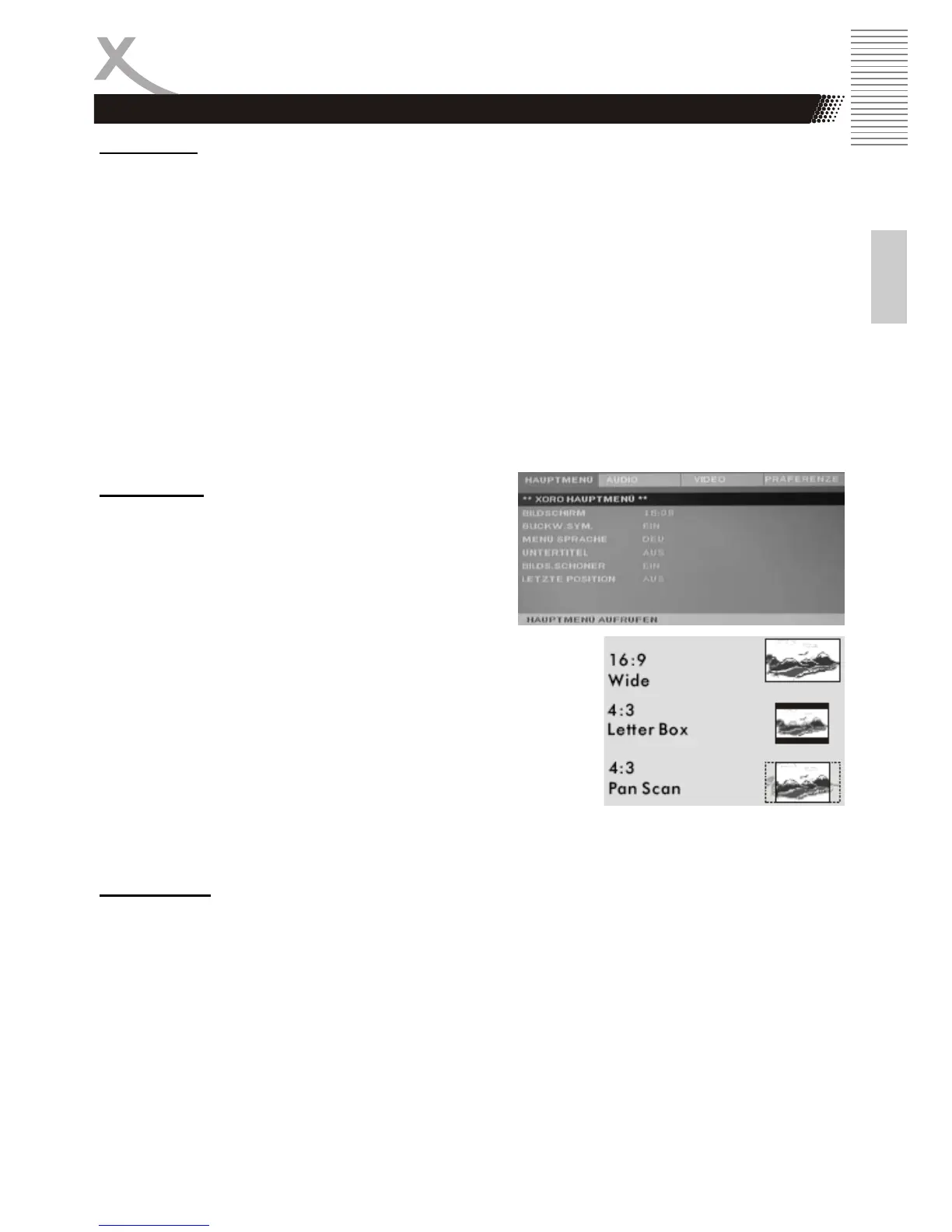 HAUPTMENU, AUDIO, VIDEO, und PRÄFERENZEN