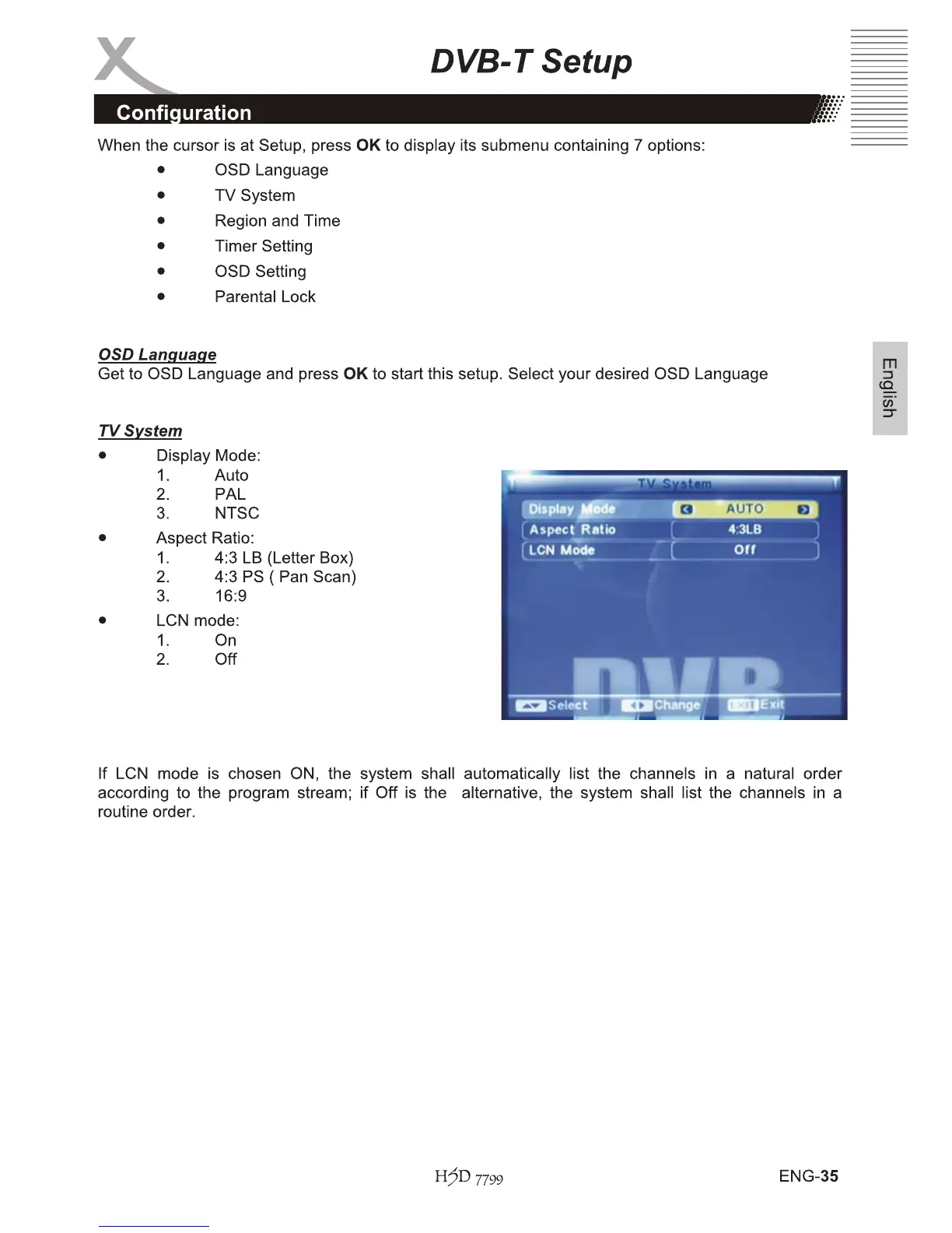 Xoro HSD 7799 - DVB-T System Configuration; General DVB-T Configuration; OSD Language Setup; TV System Settings