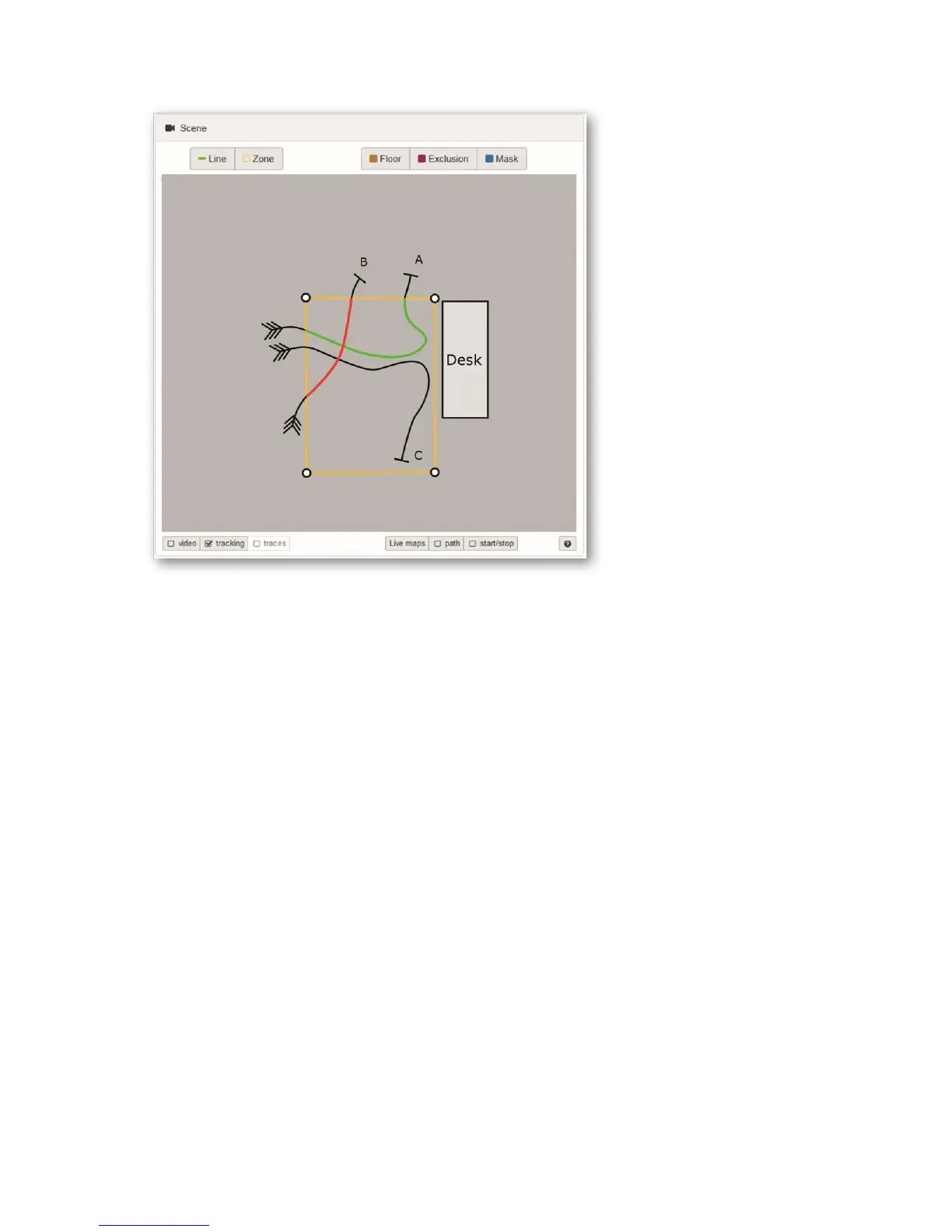 - Track A enters the dwell zone from the left, walks to the desk (where it is