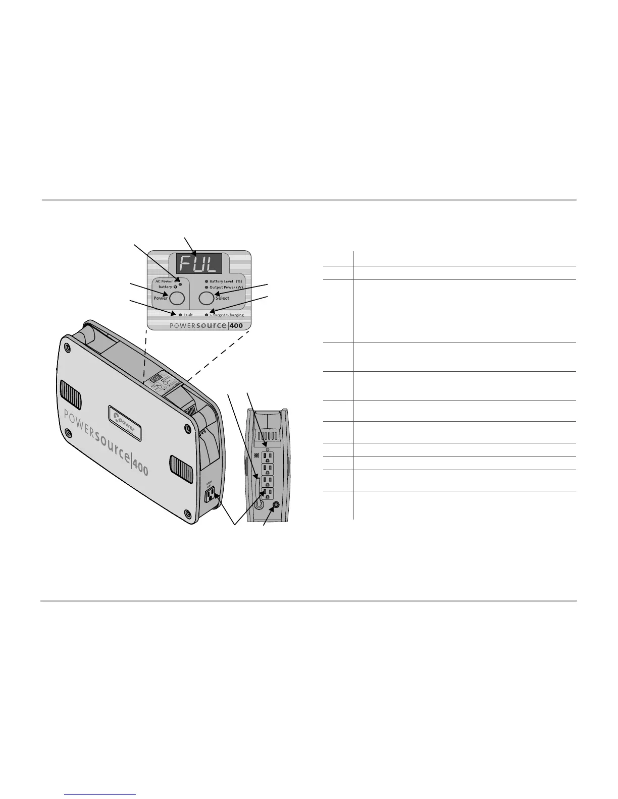 6 Charged/Charging LED (green) illuminates when PowerSource 400 is fully