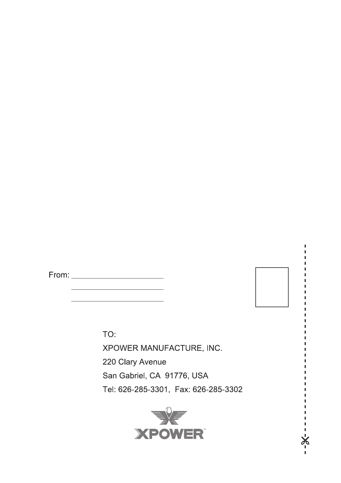 XPOWER’s Limited Warranty covers the unit (excludes POWER CORD) from defects in material