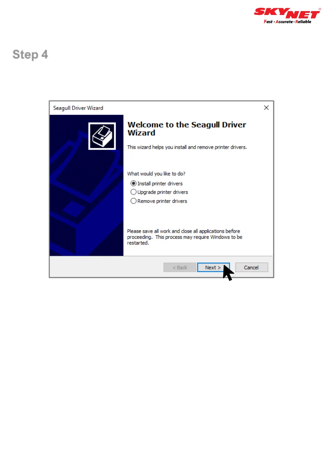 Tick to ‘Install printer drivers’. Then, click on the Next button.
