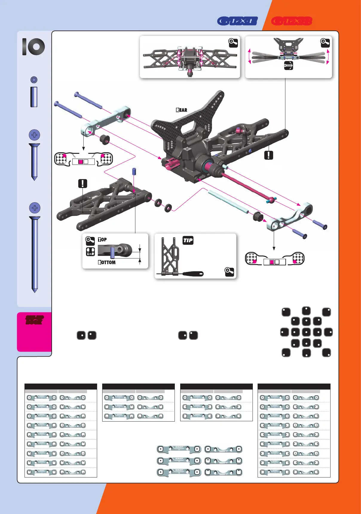 The tables describe the amounts of rear anti-squat, rear toe-in, rear track-width change depending