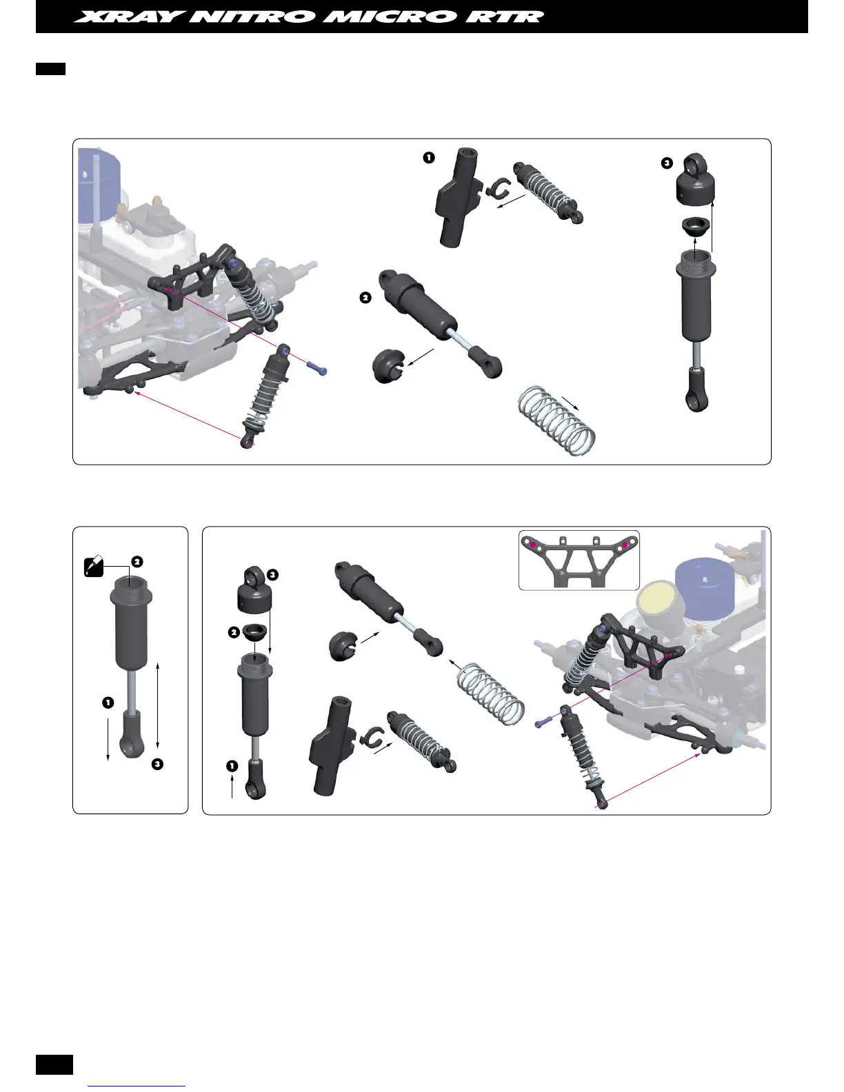 Re-install each shock absorber, fi ll each shock absorber with the supplied shock oil, and install on the micro nitro truck.