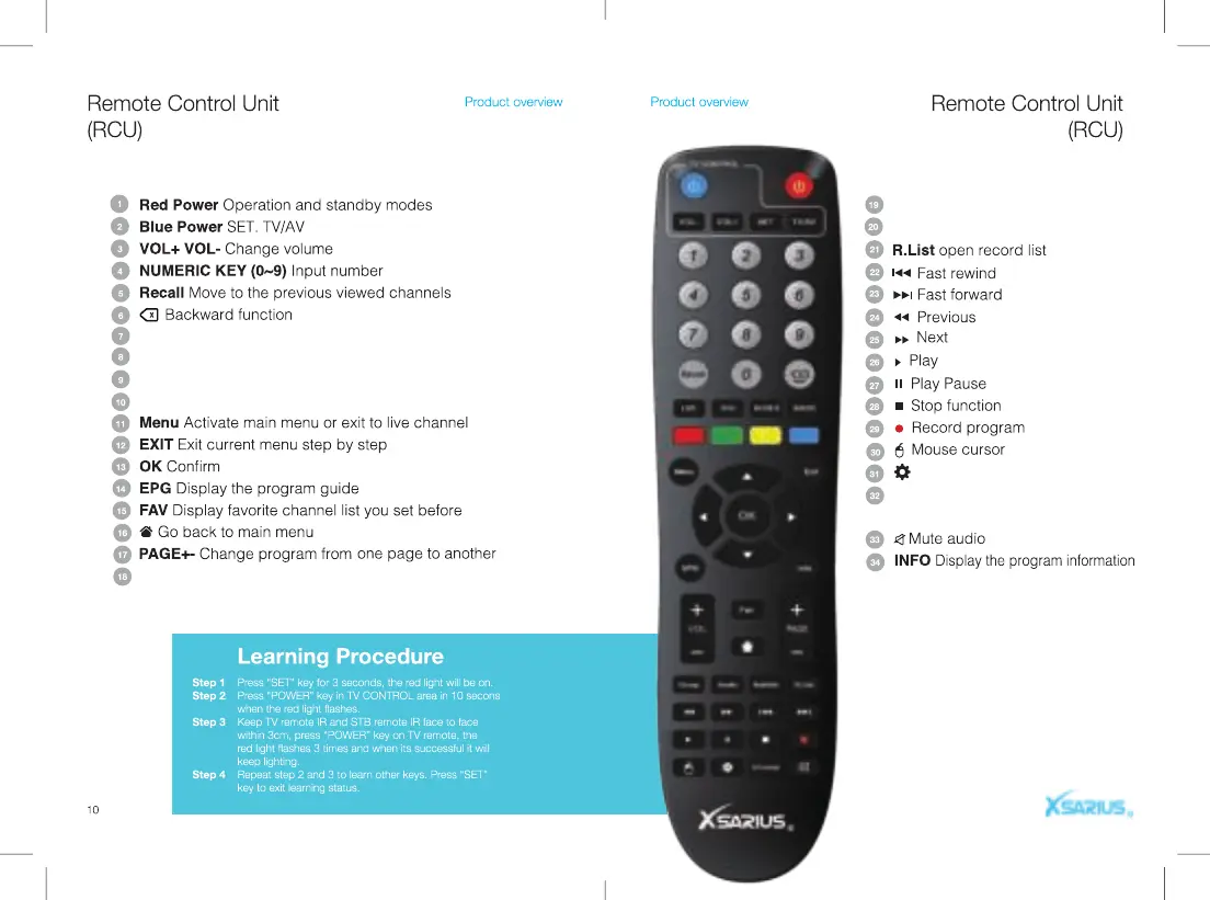 Xsarius Q3 - Remote Control Unit (RCU); RCU Button Functions; Learning Procedure
