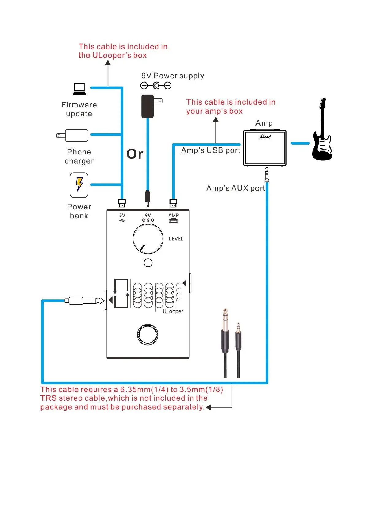 to the amp's AUX input or to external speakers/PA systems. If connected to the amp's AUX, Loop Mode