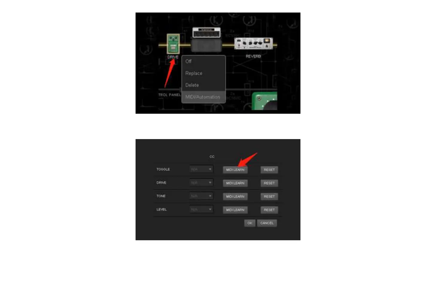 Click “MIDI Learn” at TOGGLE to start MIDI specification. the“Waiting for MIDI CC” appears on the screen. Press the foot switch on XTONE Pro that you want