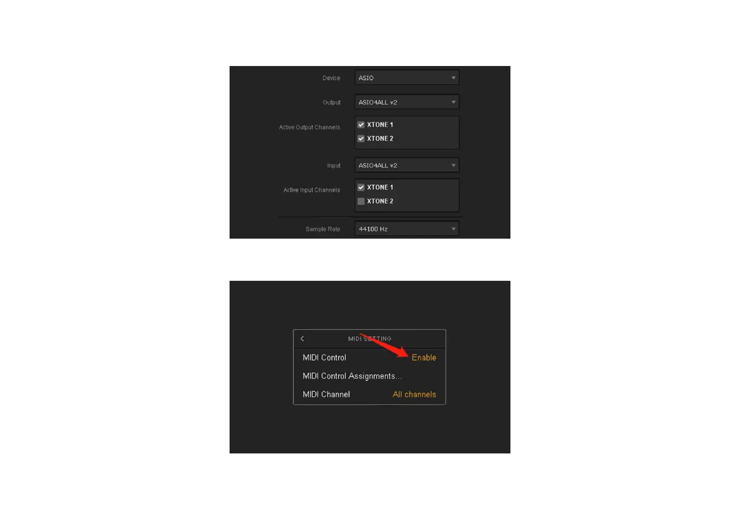 adjust the Audio Buffer Size to 64 samples and activate XTONE as MIDI Inputs.