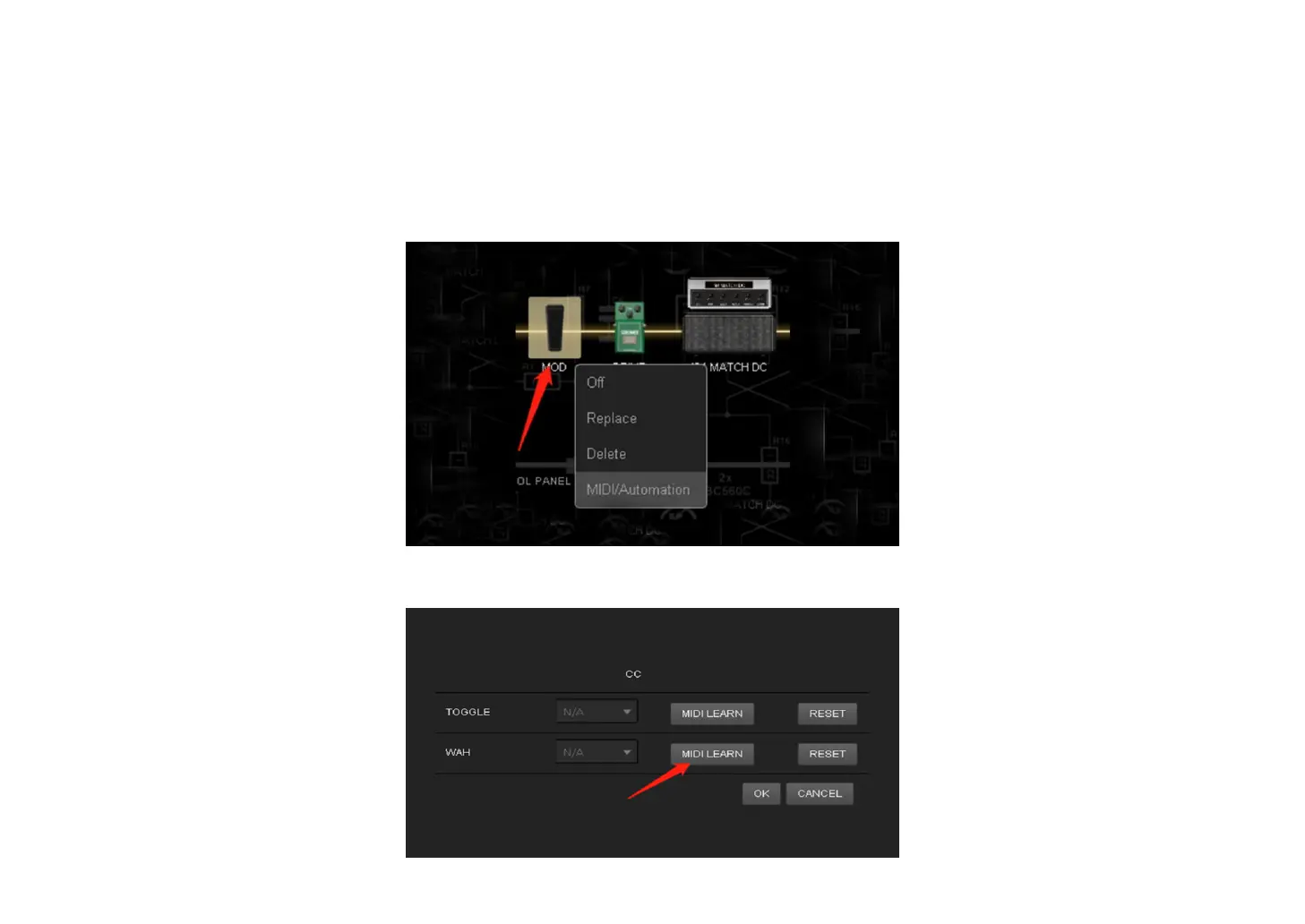 ③ Click “MIDI Learn” at TOGGLE to start MIDI specification. the“Waiting for MIDI CC” appears on the screen. Press the foot switch on XTONE(Duo) that you