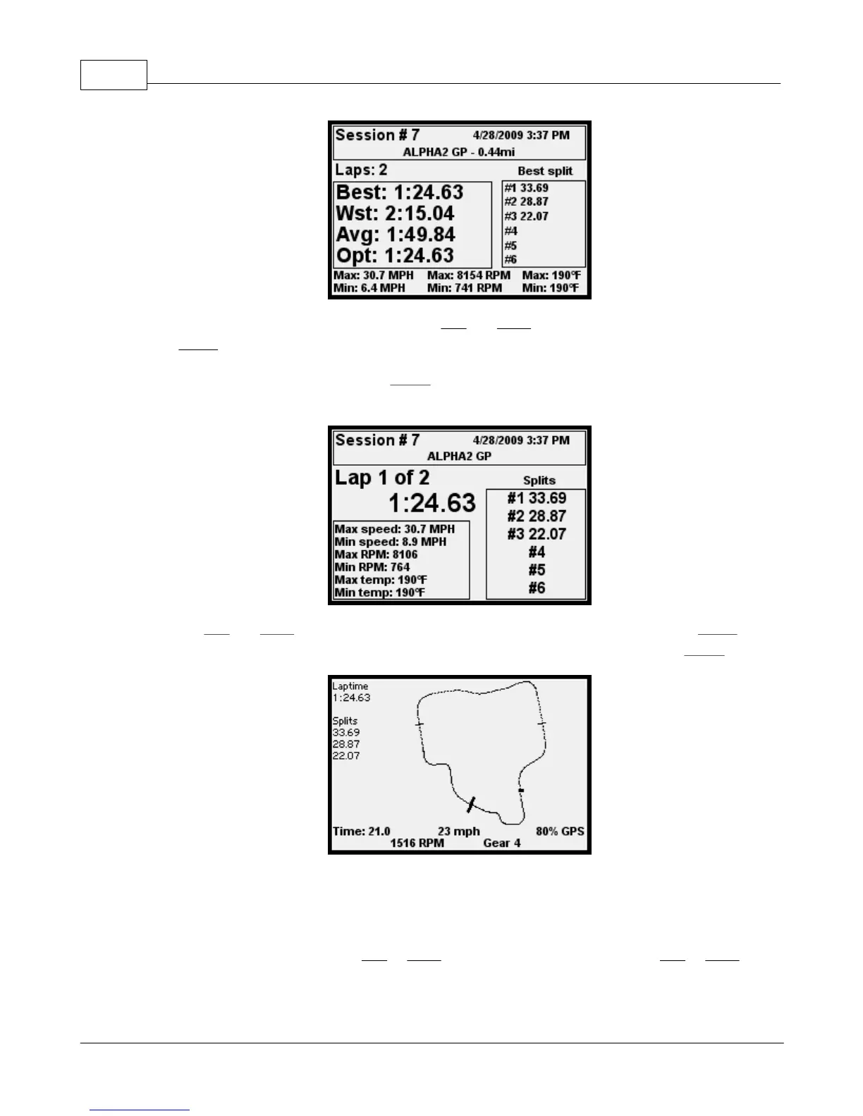 Press the Left and Right arrow button to cycle through the laps for that session. Press Menu to