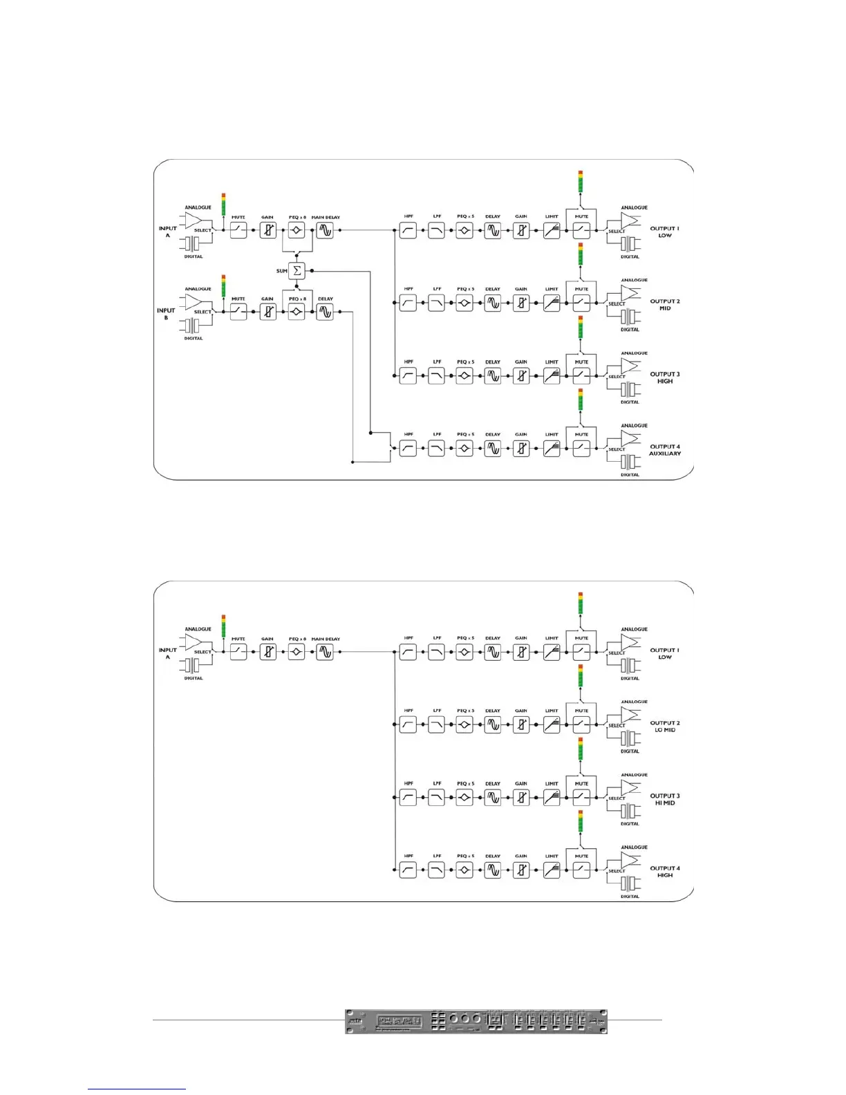 3 way crossover, with one auxiliary which may be fed from input B or A & B summed.