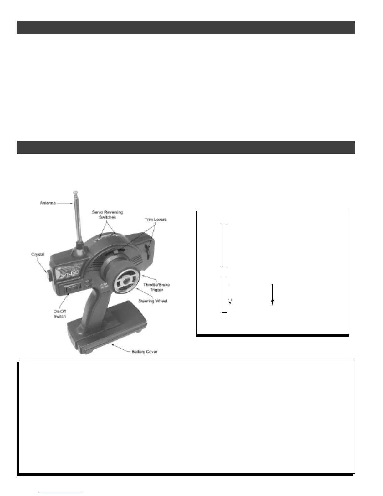 Trim Levers: These levers, one for steering and one for throttle/brake control, allow you to fine tune the servo's center by sliding the levers on the