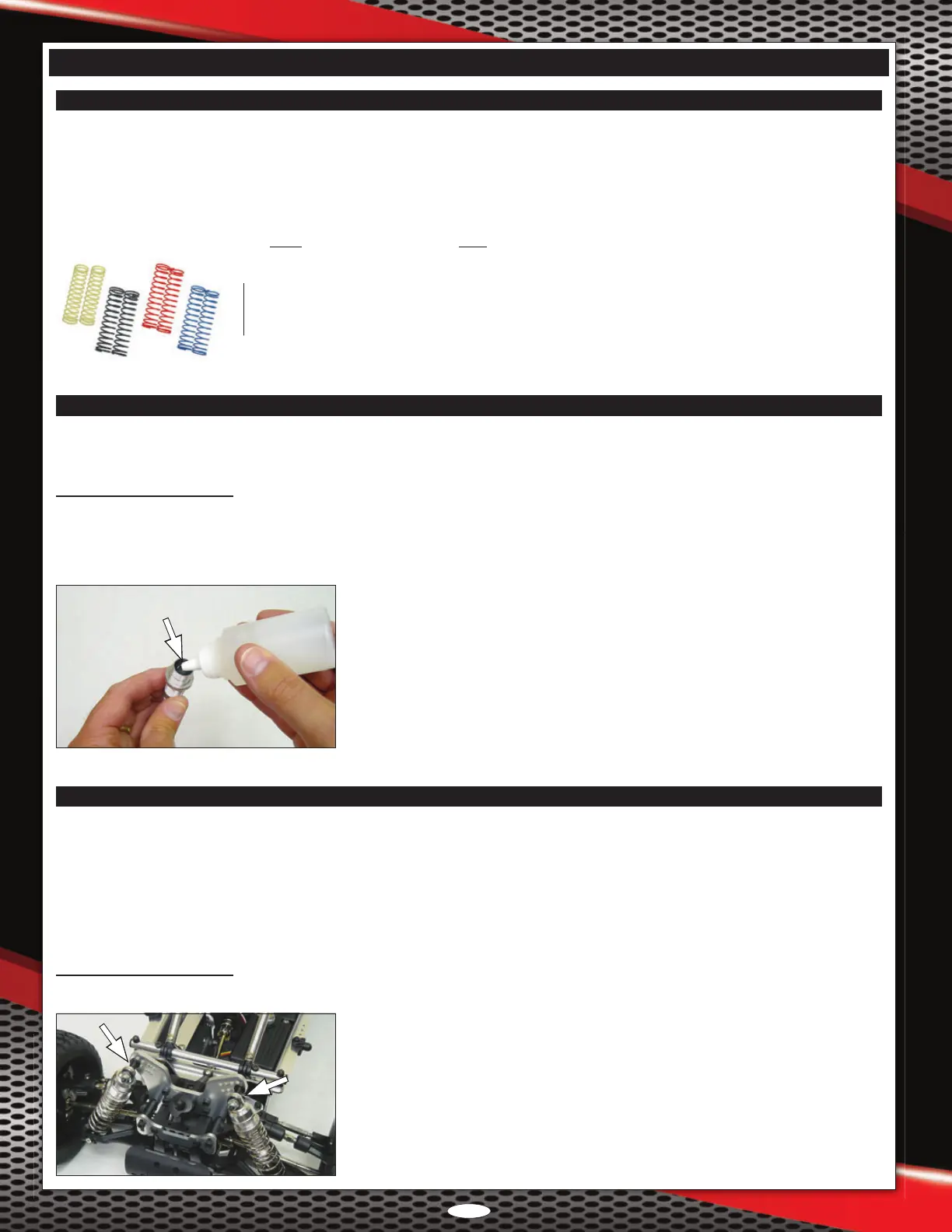 We recommend using the shock oil that the shocks are already lled with. For racing, you may want to consider using 40 weight