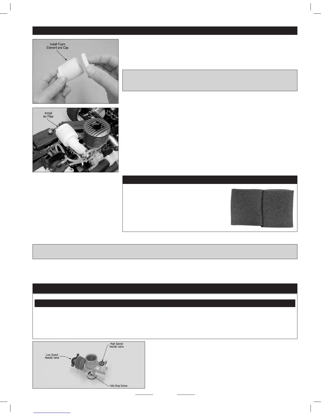 different parts of the engine's carburettor and how to adjust the carburettor's needle valves to tune the engine. Failure to read