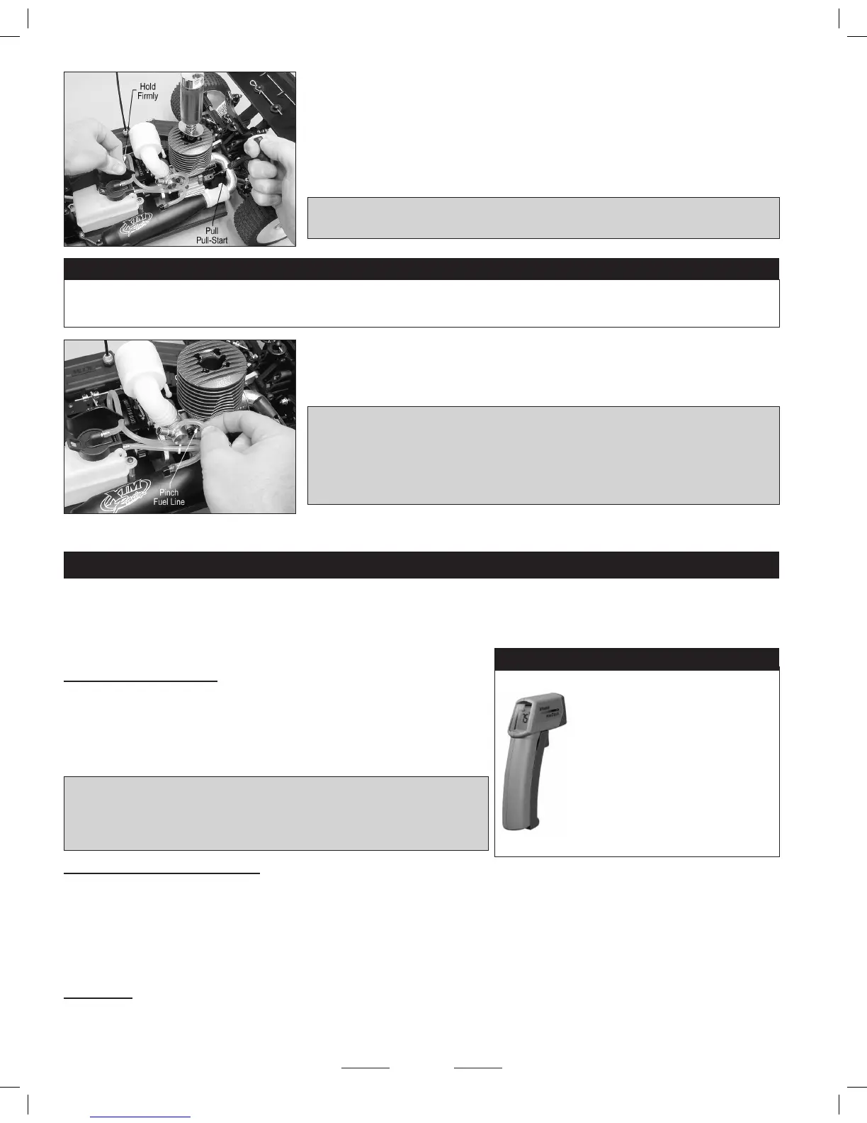 WARNING Be careful not to touch any parts of the engine or the tuned pipe because they